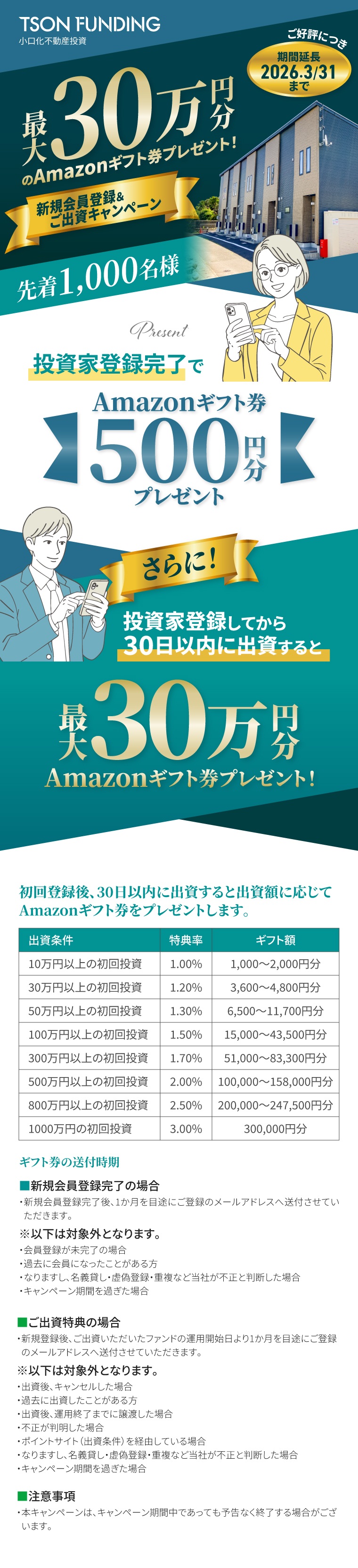 大変お得なキャンペーンですので、是非ともご出資ください。<先着1,000名 2026年3月31日まで>